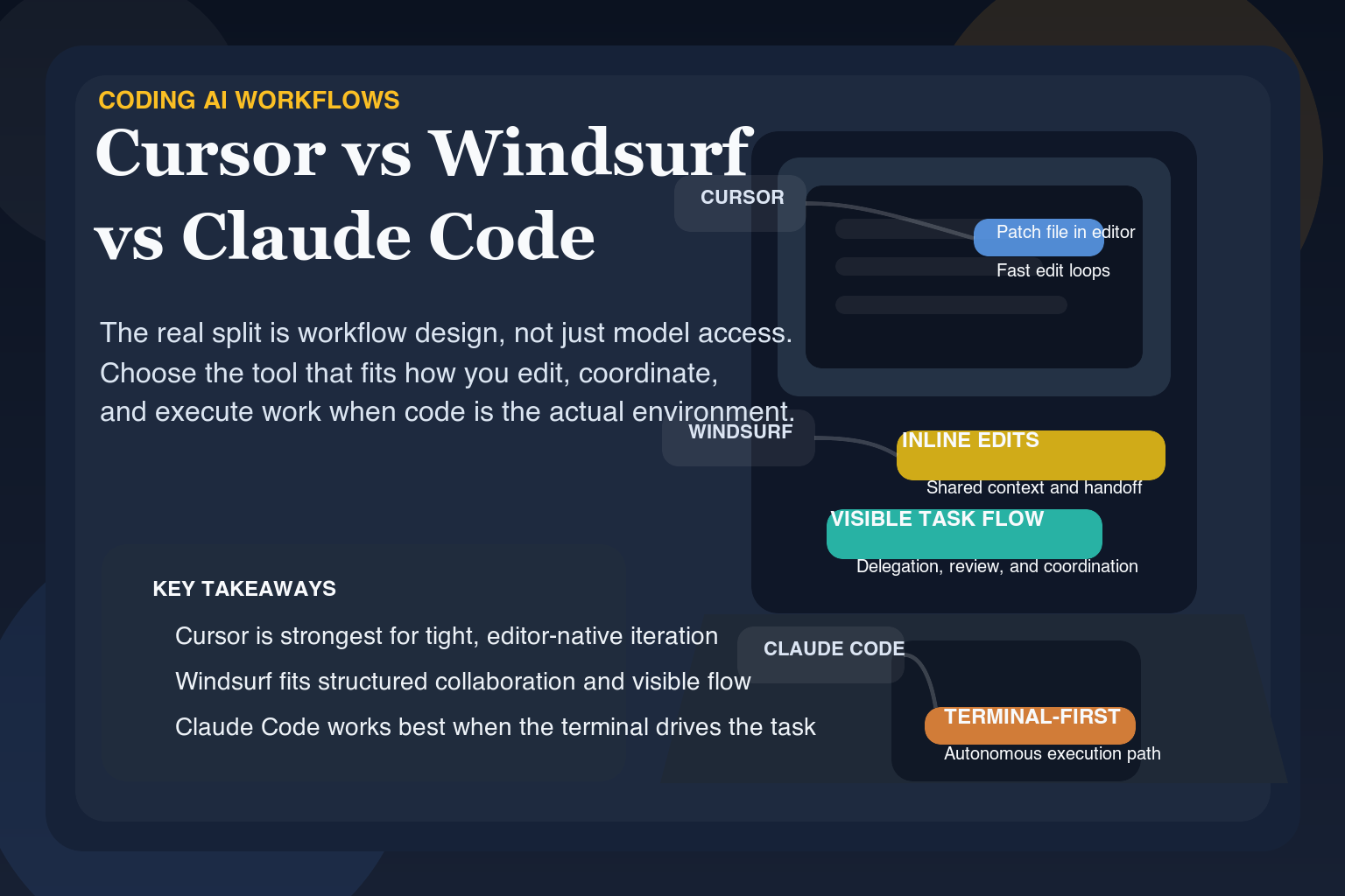 - Cursor, Windsurf, and Claude Code are increasingly competing on workflow shape rather than raw model access.